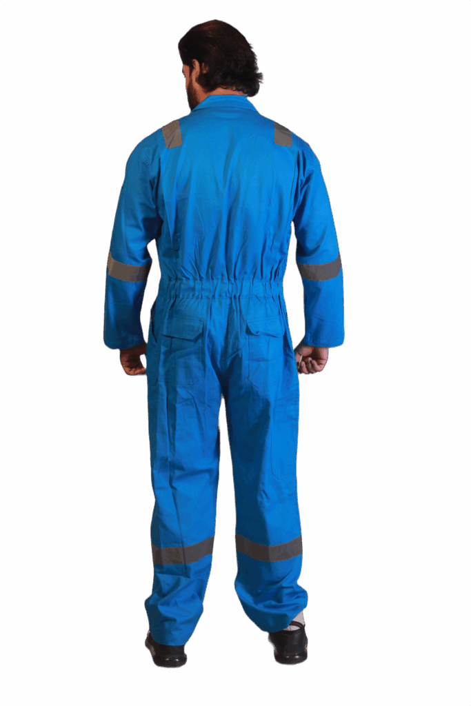 The GE/CL/016 combines design with practicality in a striking blue colour. Its front closure features both a zipper and a snap for easy wearing. Two side pockets are enhanced with inner excess space, while two chest and two back pockets come with snap fasteners, providing ample room for tools and personal items in an industrial setting. An additional sleeve pocket adds to its storage capabilities. Reflective tape is on the sleeves, shoulders, and legs for added safety during low-light situations in an industrial setting. With an elasticated waist, wearers can enjoy a comfortable fit throughout the day. Embrace both style and utility with the GE/CL/016.