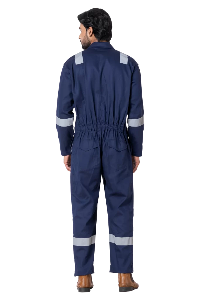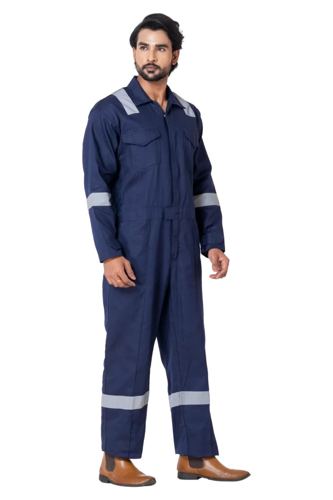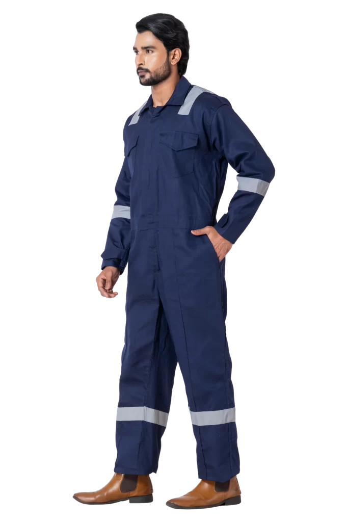 Made from 100% cotton with a 200 GSM weight, this garment offers comfort and durability for daily wear. It includes a 2″ reflective tape for improved visibility in low-light conditions. The front closure features a nylon zipper with button fastening for added convenience. Functional storage is provided with a pen pocket on the left arm and a tool pocket on the right leg, making it ideal for industrial and professional use.